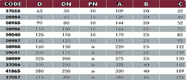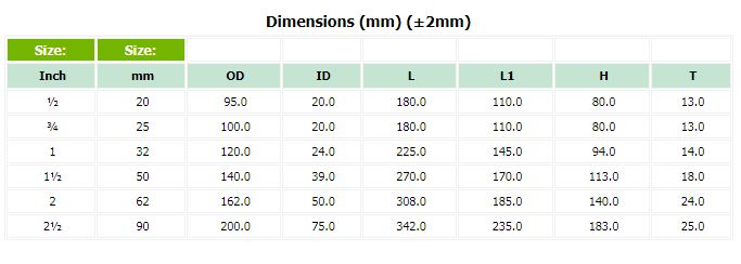 | Dia | Code | DN(mm) | D(mm) | D1(mm) | D2(mm) | L(mm) | L1(mm) | H(mm) | Kg/Pie | Pcs / Box | PN |